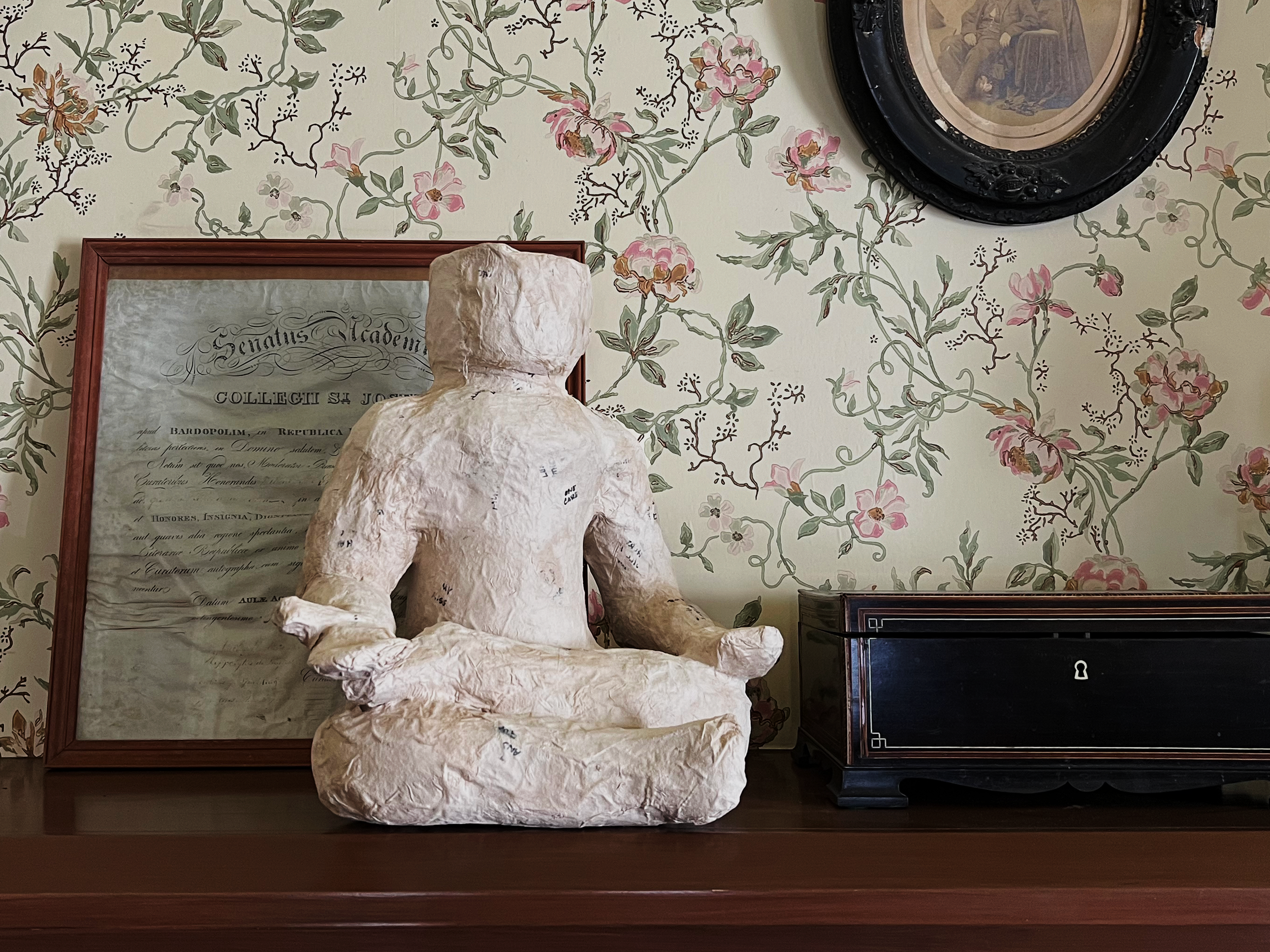 Rituals: The Liminality of Death creates a space that recalls traditional practices surrounding the death of a loved one. This installation is located in a refurbished 1868 home, The Conley House, that features two conjoined spaces.